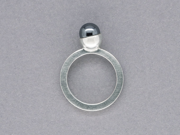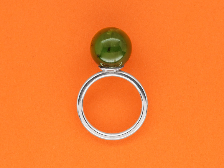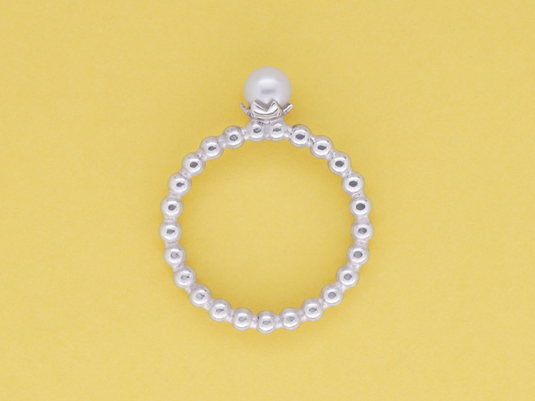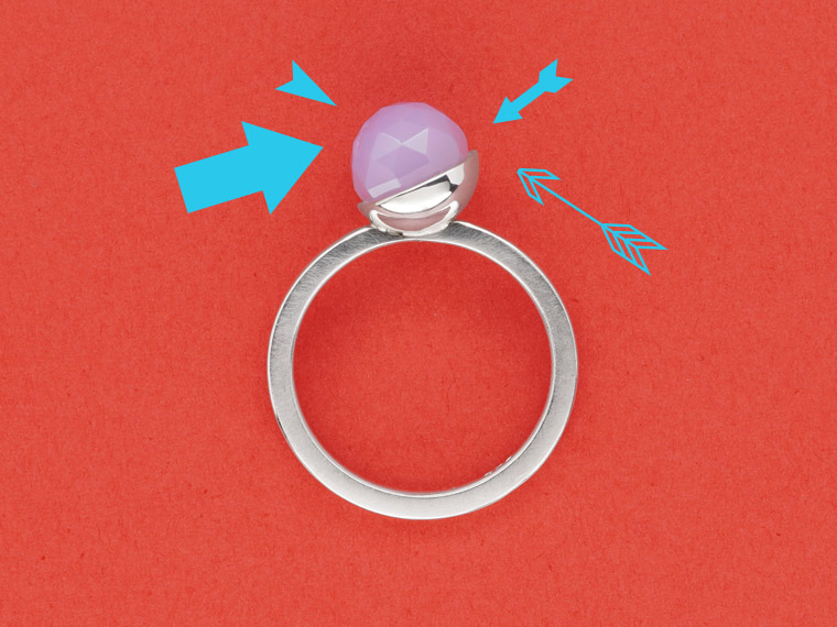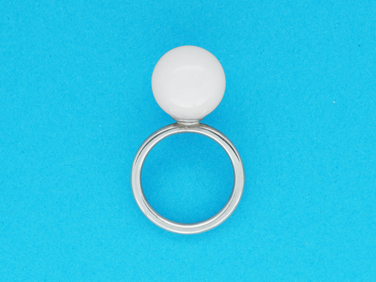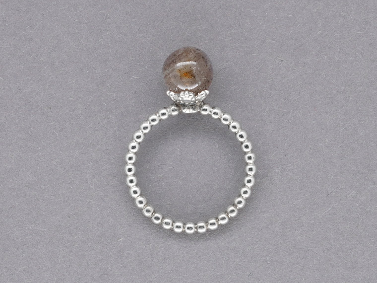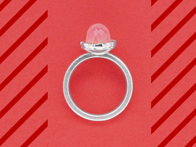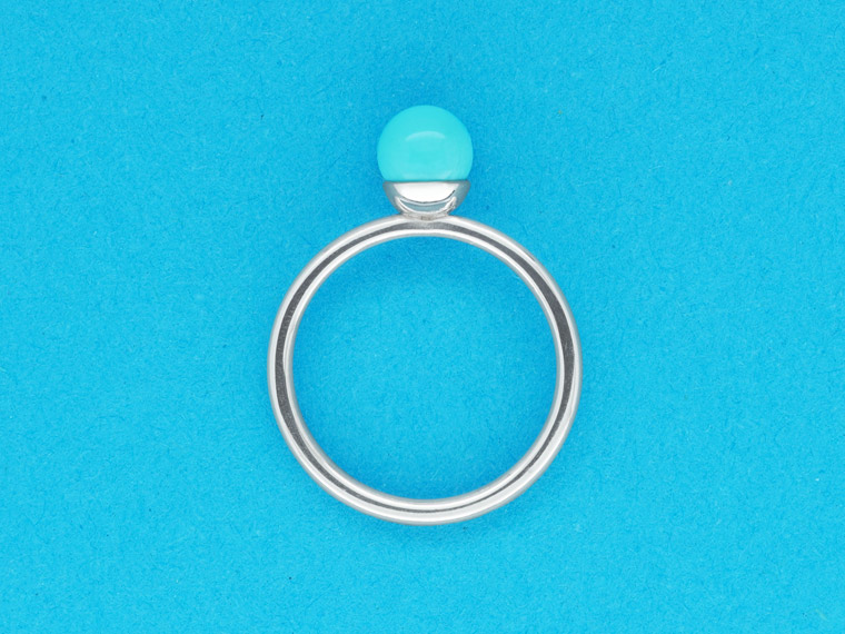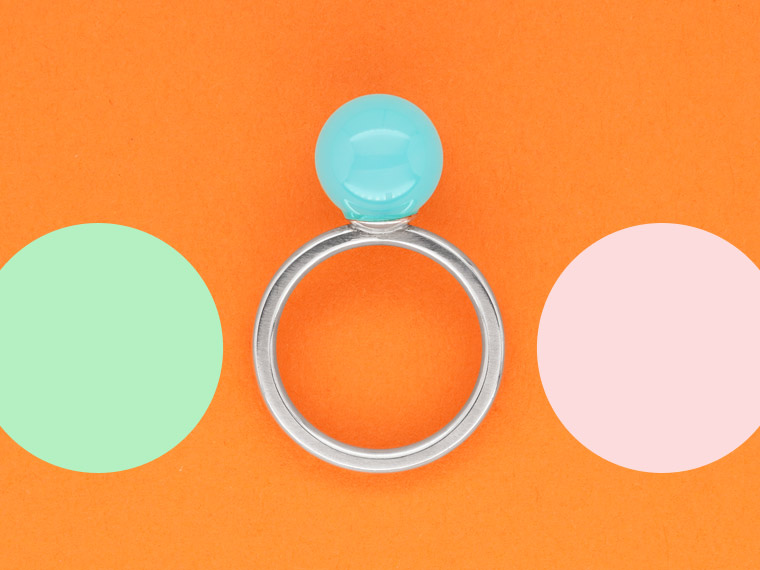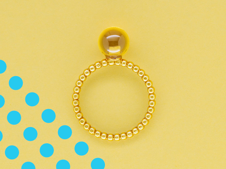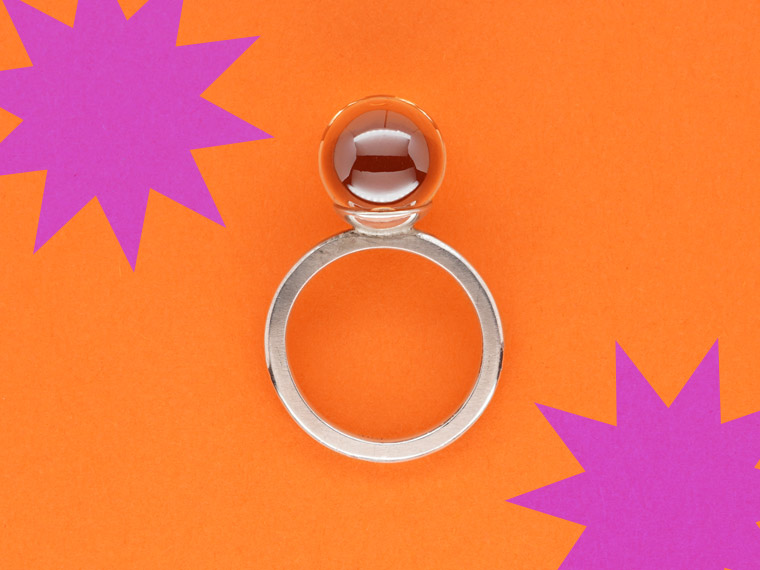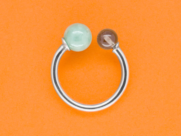 Kiosque steht im Französischen für einen kleinen Verkaufsstand mit reicher Auswahl an Kostbarkeiten, die das Leben schöner machen. Dieser Kiosque lädt zum Kombinieren und Variieren ein. Am Finger finden Citrinkugel, Perle, Diamant und Rauchquarzkegel zusammen und feiern ein buntes Fest aus Form und Farbe.